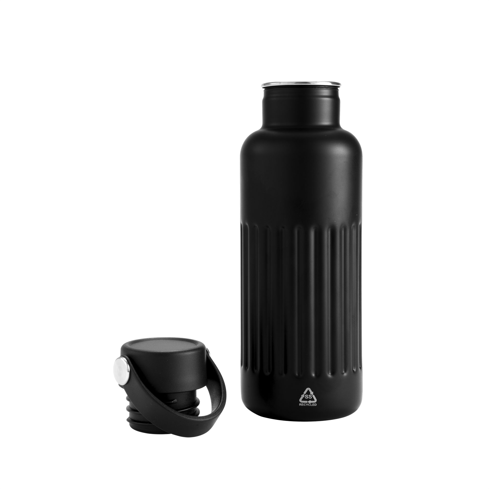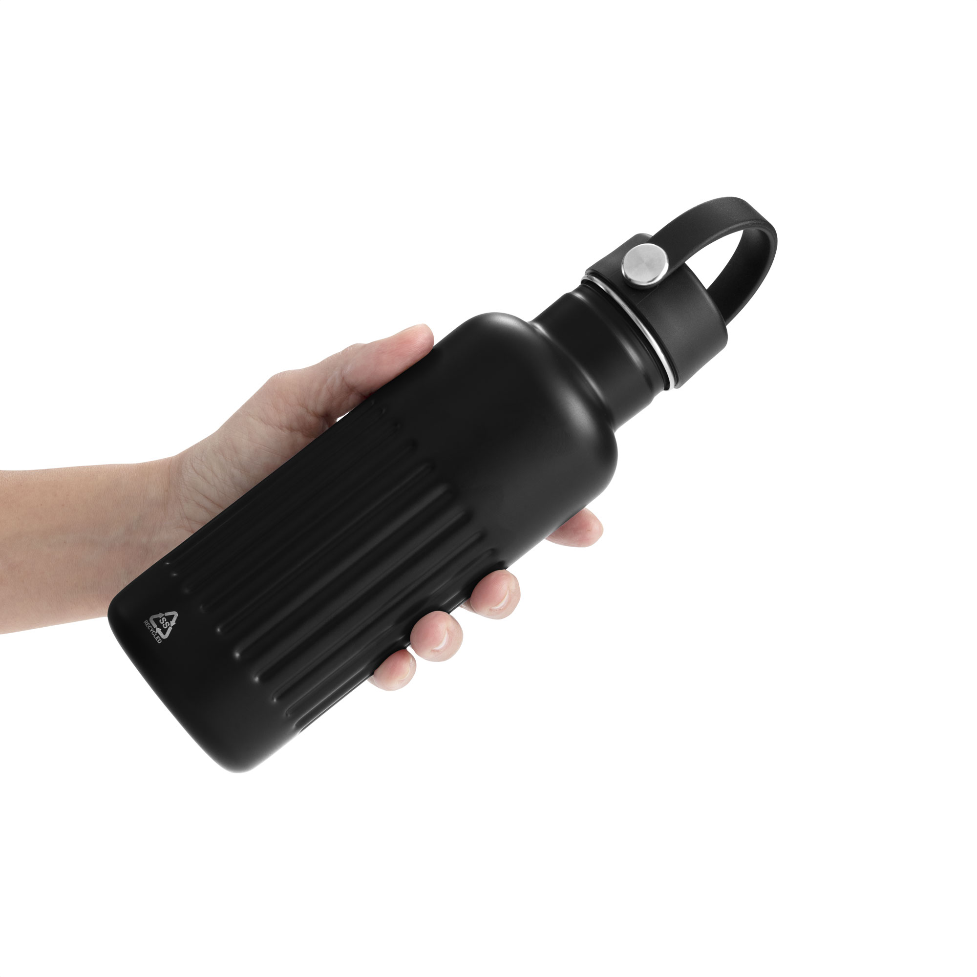 Botella doble pared, sellada al vacío. Botella con aislamiento térmico. Tecnología vacuum. Interior de acero 304 reciclado y exterior de acero 201. Tapa a rosca de polipropileno, interior plástico. Asa reforzada de silicona. Pintura acabado semi mate. Cuerpo texturado para un mejor agarre. Mantiene hasta 12 hs la temperatura de las bebidas calientes y 24 hs de las bebidas frías.